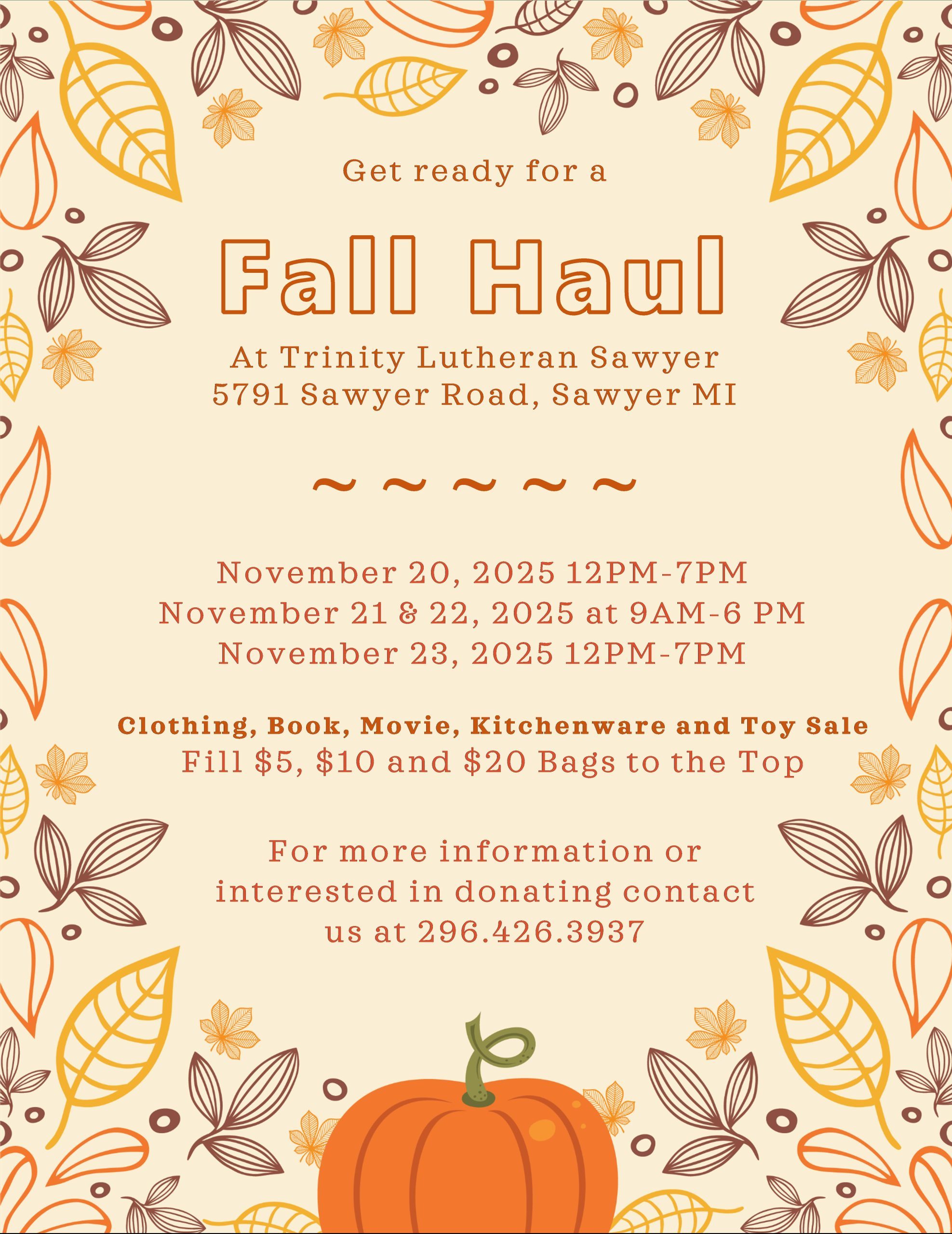 Fall Haul will be over 4 days November 20 – 23(for exact dates & times check flyer). This will be fill a bag style sale with 3 different sized bags price $5, $10, or $20. We are taking donations of clothing, Books, Movies (any media form, ie: VHS, DVD…) Kitchenware, and Toys. Contact the Office for any further questions.